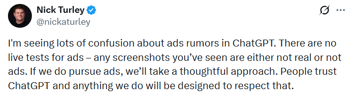 सोशल मीडियावर चॅटजीपीटीमध्ये जाहिराती दिसल्याच्या दाव्यांदरम्यान, ओपनएआयचे उपाध्यक्ष आणि चॅटजीपीटी प्रमुख निक टर्ले यांनी X वर पोस्ट करून स्पष्ट केले की कंपनी चॅटजीपीटीवर जाहिरातींची चाचणी करत नाहीये.
