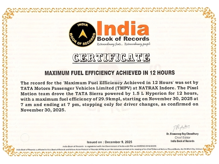 यापूर्वी, फोक्सवॅगन टायगुनच्या 1.0 TSI इंजिनने 2024 मध्ये 24 तासांच्या धावपळीत 29.8kmpl चा मायलेज मिळवून विक्रम केला होता, ज्यात 1,300 किलोमीटरपेक्षा जास्त अंतर कापले गेले होते. टाटा सिएराने कमी वेळातच याला मागे टाकले.